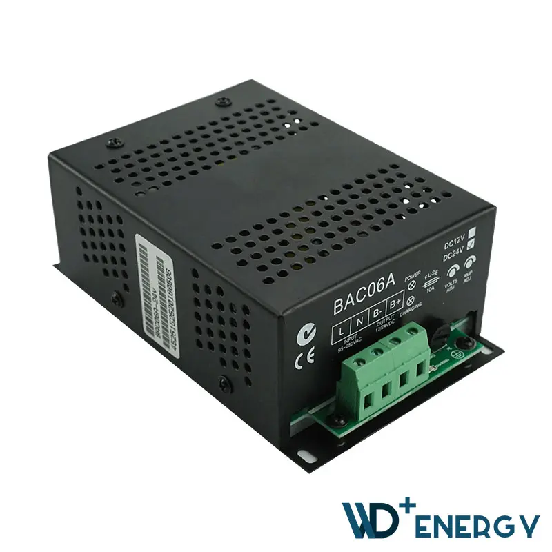 El cargador de batería de la serie BAC06A adopta los últimos componentes de alimentación del interruptor, que está diseñado para cargar la batería de arranque de plomo-ácido de acuerdo con su propiedad. El cargador es adecuado para la carga flotante de baterías de plomo-ácido. La corriente de carga máxima para un cargador de 12 V es de 6 A; la corriente de carga máxima para un cargador de 24 V es de 3 A.